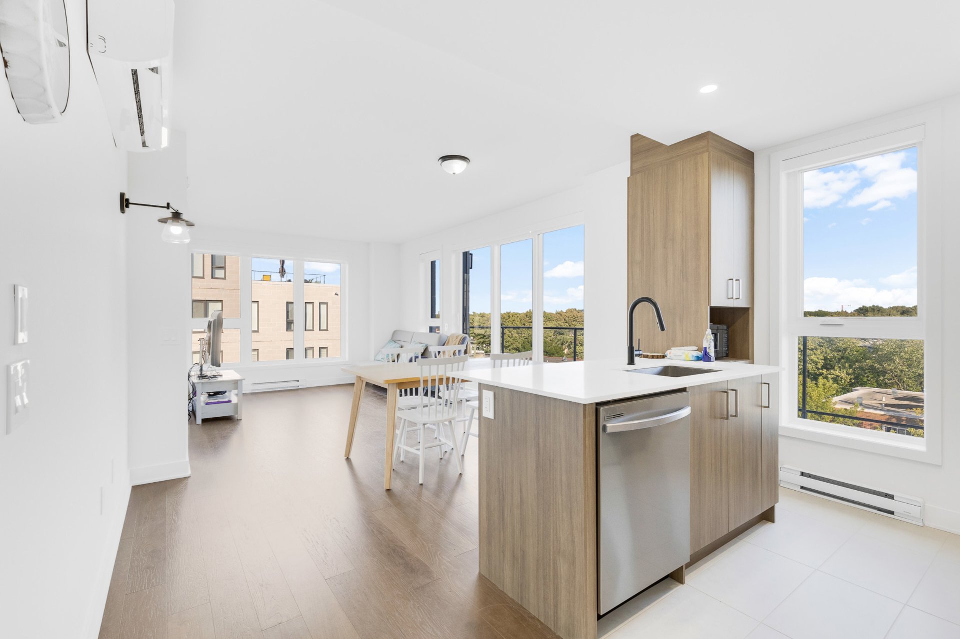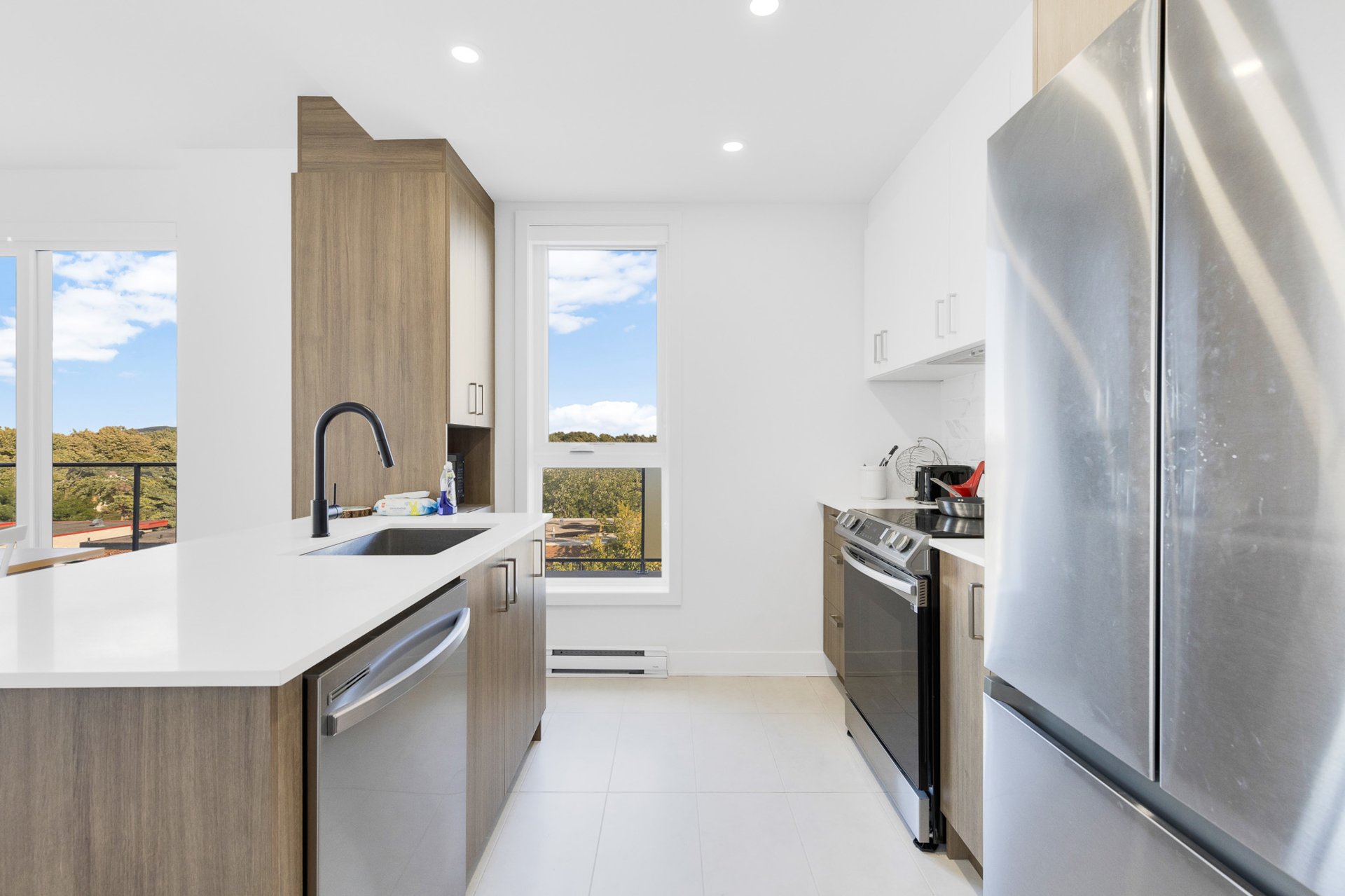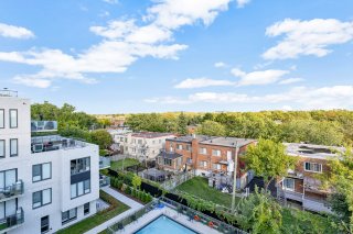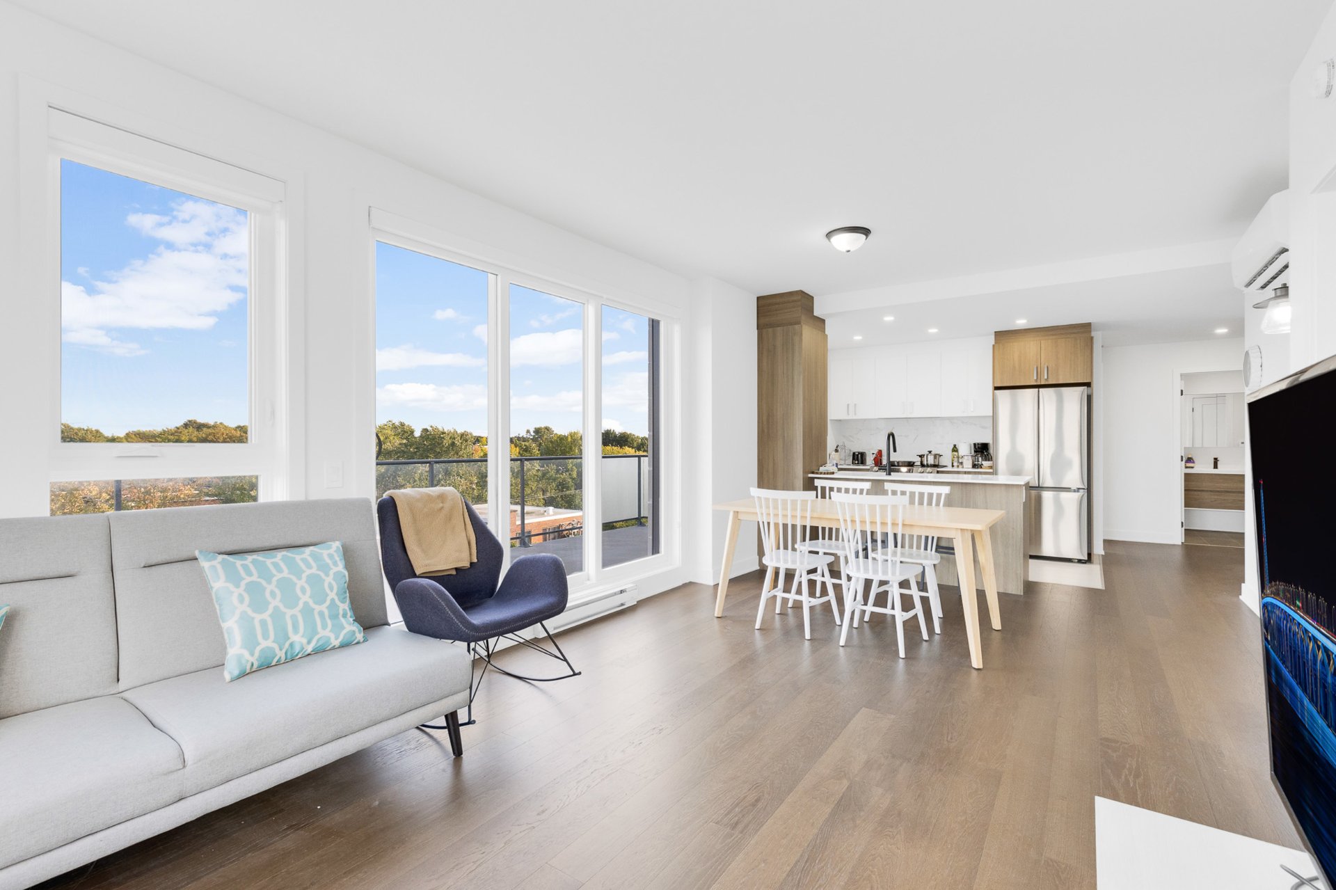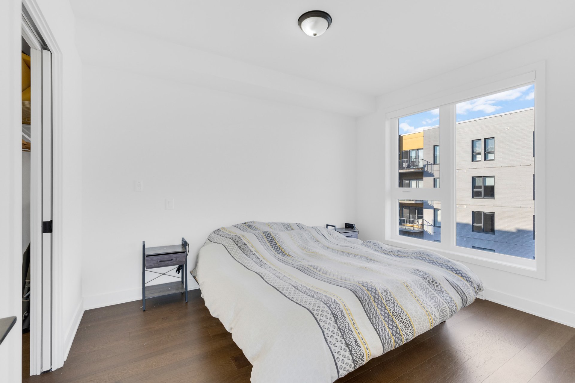 Bright and modern 2-bedroom condo in prime Saint-Laurent, offering style, comfort, and convenience. Open-concept layout features floor-to-ceiling windows, wide-plank hardwood floors, and a spacious private balcony. Contemporary kitchen boasts two-tone cabinetry, sleek white countertops, and a waterfall island with seating. Primary suite includes a walk-through closet and ensuite with glass shower, while the second bedroom is spacious and versatile. Building amenities include rooftop terrace, outdoor pool, gym, secure lobby, and landscaped grounds. Steps to Côte-Vertu Metro, Place Vertu, parks, shops, and restaurants.