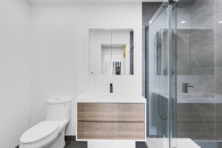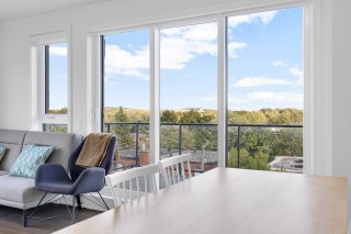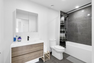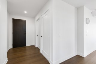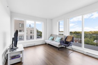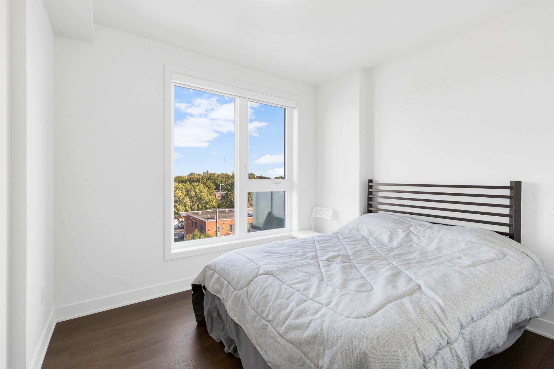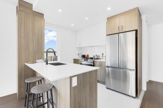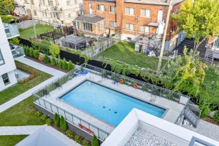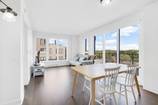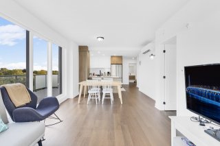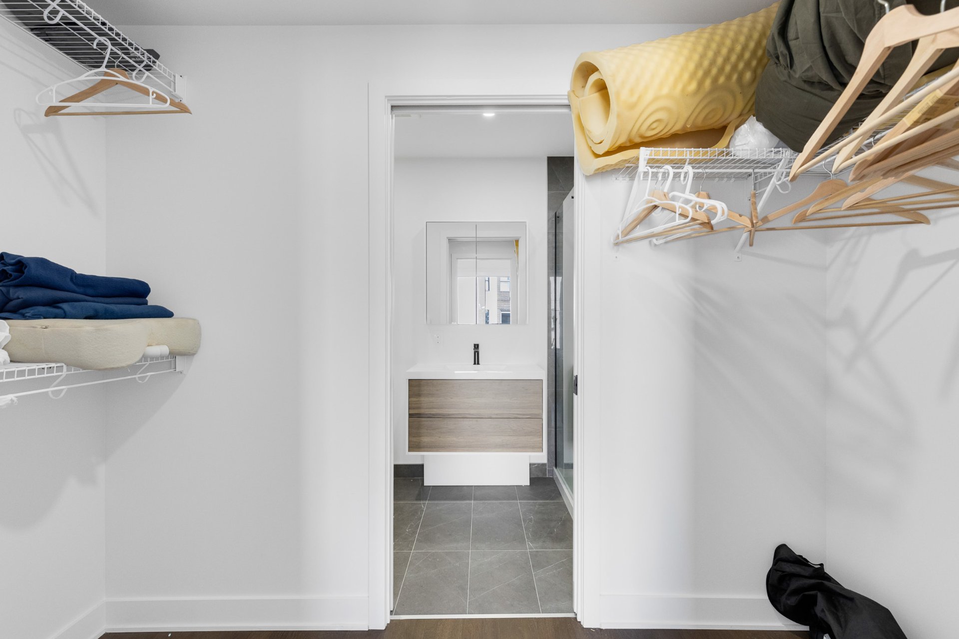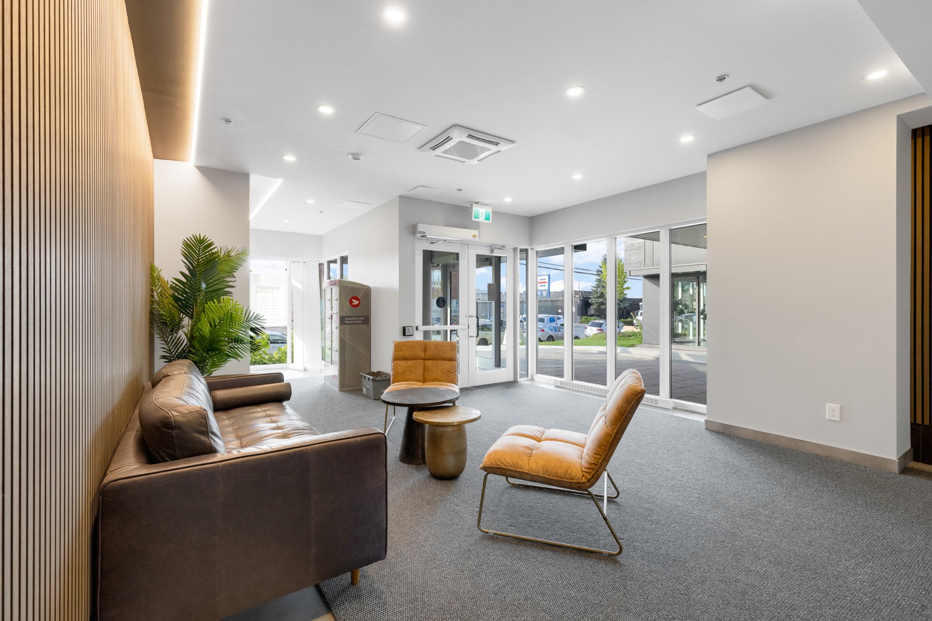 Bright and modern 2-bedroom condo in prime Saint-Laurent, offering style, comfort, and convenience. Open-concept layout features floor-to-ceiling windows, wide-plank hardwood floors, and a spacious private balcony. Contemporary kitchen boasts two-tone cabinetry, sleek white countertops, and a waterfall island with seating. Primary suite includes a walk-through closet and ensuite with glass shower, while the second bedroom is spacious and versatile. Building amenities include rooftop terrace, outdoor pool, gym, secure lobby, and landscaped grounds. Steps to Côte-Vertu Metro, Place Vertu, parks, shops, and restaurants.
